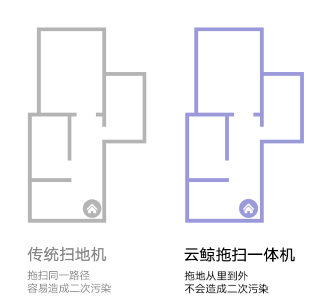 而且云鲸 J1 机器人在拖地的时候也是很科学地采用了「从里到外」的拖地路径,不会重复清洁、避免二次污染。