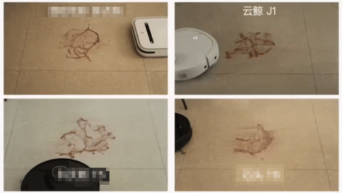 可以看到,那种贴着布的扫地机器人,几乎应付不了这样的污渍,而云鲸 J1 扫过的地方,立马就干净了,而且还是一次就清理干净!
