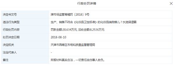 值得注意的是,天眼查显示,2018年8月10日,天津市康婷生物工程集团曾因生产、销售不符合《化妆品卫生标准》的化妆品,被天津市西青区市场和质量监督管理局罚款20.63万元, 没收8.25万元。