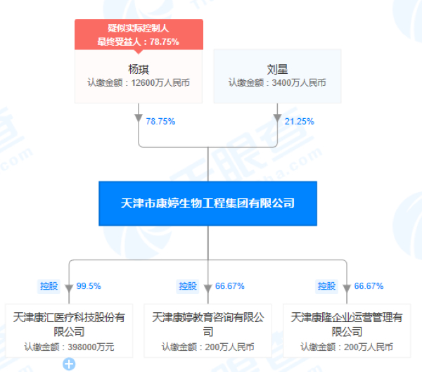 天眼查显示,天津市康婷生物工程集团成立于1996年9月,注册资本为16000万元。杨琪是持股78.75%的大股东,同时也是法定代表人、经理,执行董事;刘星是持股21.25%的二股东。