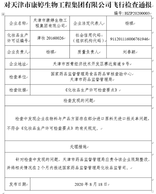 通报称,检查中发现天津市康婷生物工程集团在物料与产品方面存在部分进口原料无进口投关单问题,不符合《化妆品生产许可检查要点》的有关规定。