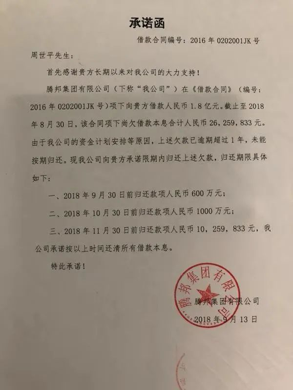 为了证明自己所言不虚,老周还将腾邦集团2018年9月给自己立下的还款承诺函张贴出来,大有立此为证的意味。老周的“广而告之”,真的让小伙伴们都惊呆了。腾邦国际忒胆大了!1.8亿的还款公告竟然是假的。如果对深交所问询函的正式回复都敢这样堂而皇之的“造假”,那么,除了高达200多亿的负债,腾邦国际还有什么是真的?