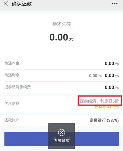 值得注意的是,富民银行试图劝说借款人一次性偿还贷款。借款人提供的截图显示,富民银行还款页面上有优惠条款,如果借款人现在一次性偿还贷款,富民银行会返还用户一半贷款利息。