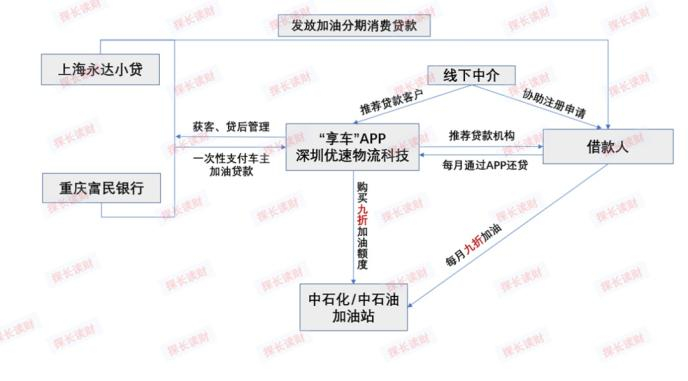 车主通过“享车”APP申请了富民银行的加油分期贷款,随后,富民银行将贷款金额一次性打给“享车”APP的主体深圳优速物流科技,后者去中石油/中石化加油站帮车主购买加油额度(即所谓的“九折加油”优惠),车主去加油站加完油后, “享车”APP次月会从车主银行卡扣款(比如车主上月加油500元,则次月扣款450元),偿还银行分期贷款。