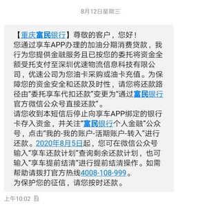 2020年8月12日,富民银行向客户发送短信称,即日起,用户还款路径由“享车代扣”变更为“富民银行官方微信公众号”直接还款。