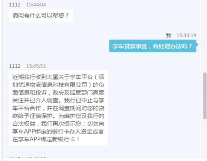 在面对车主的线上咨询时,富民银行客服称,已收到大量关于享车平台的负面信息和投诉,监管部门已介入调查,富民银行已中止与享车平台合作,并在调查期间对用户贷款给予征信保护。同时,富民银行提醒称,切勿向享车APP绑定的银行卡存入资金或绑定新银行卡。