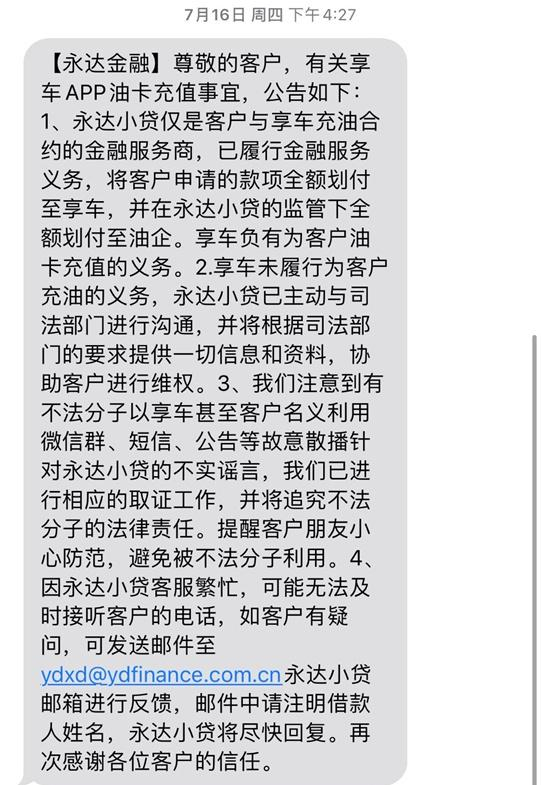 有车主称,7月份收到永达小贷的短信。永达小贷称,其已将客户申请贷款全额划付至享车,并在永达小贷的监管下全额划付至油企,享车负有为客户油卡充值的义务。由于享车未履行这一义务,永达小贷已主动与司法部门进行沟通,协助客户维权。