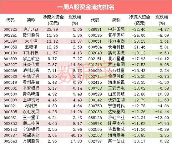 单只股票来看,20股近五日主力资金净流出超10亿元,包括中芯国际、复星医药、格力电器、长电科技、紫光国微等。芯片巨头中芯国际主力资金净流出32.4亿元排在首位,该股本周下跌4.87%。生物疫苗龙头复星医药主力资金净流出24.6亿元,本周累计下跌8.09%。