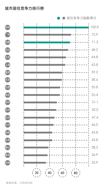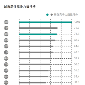 新一线城市中,居住竞争力指数较高的城市有成都、武汉、重庆、天津等,其中成都的居住竞争优势在新一线城市梯队中脱颖而出。成都小区周边资源配套相较均衡与完善,其居住便利性指数仅次于北上广深,城市拥堵指数也低于大部分样本城市。此外,成都2020年上半年成交均价为14049元/平方米,住房成本占收入的比例明显低于杭州、南京等城市。