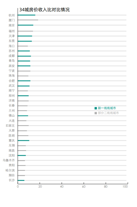 新一线城市中,杭州和南京的房价收入比领跑,甚至超过了广州;杭州、合肥、南京的房价涨幅明显超过居民收入增长;厦门房价收入比为18.9,仅次于深沪京。