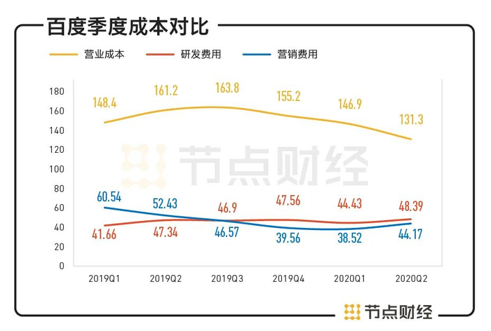百度稳健的盈利能力除了得益于公司的高业务水平,也归功于公司近一年的开源节流,特别是在内容成本和流量成本方面的有效管控,渠道营销费用的下降等。财报显示,百度2020年Q2的营业成本同比下降19%至131亿元,营销费用同比下降16%至44亿元。