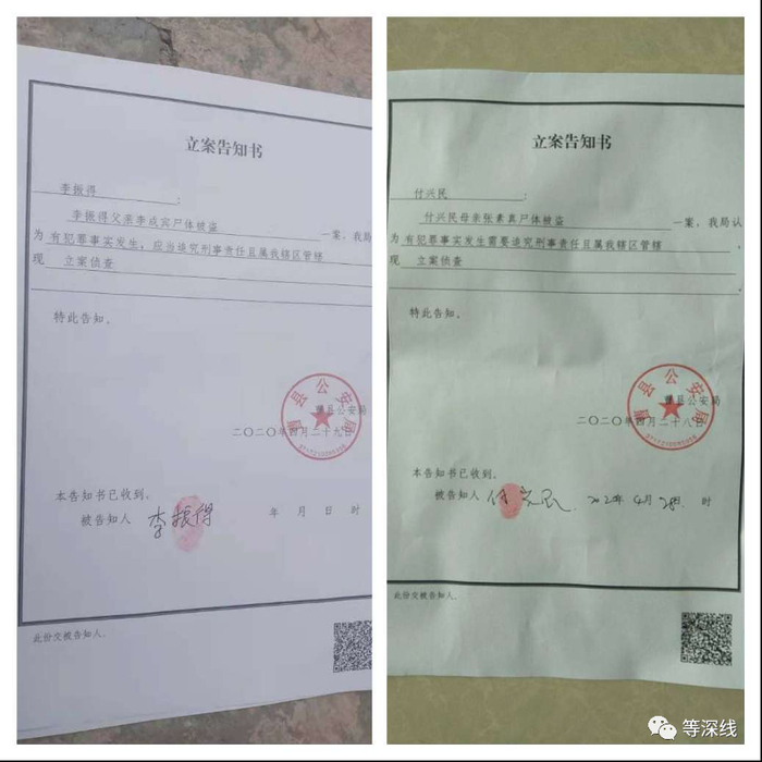 2020年4月29日,曹县公安局对“李振德父亲李成宾尸体被盗一案”进行立案侦查。曹县公安局治安大队大队长李付学告诉李家兄弟,李亮、王领和刘春都已经因涉嫌犯罪被立案侦查,如今三人都处于监视居住状态。李付学告诉家属,监视居住的时限最长不得超过6个月,案件尚在侦查中,还未移交检察院。