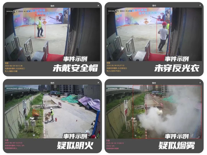 工友突发疾病倒地、项目内突然起火、冒烟,有人非法入侵翻墙进入等工地上的异常状况,统统都在智慧工地高清摄像头的监控范围之内,配合AI智能算法技术加持,可以自动侦测14种安全隐患场景,实时发出警报。
