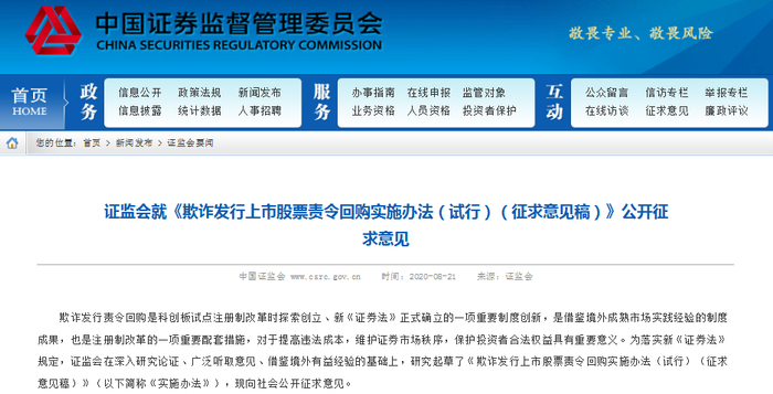 8月21日晚间,证监会发布《欺诈发行上市股票责令回购实施办法(试行)(征求意见稿)》,明确了回购价格、回购对象、回购程序等内容。