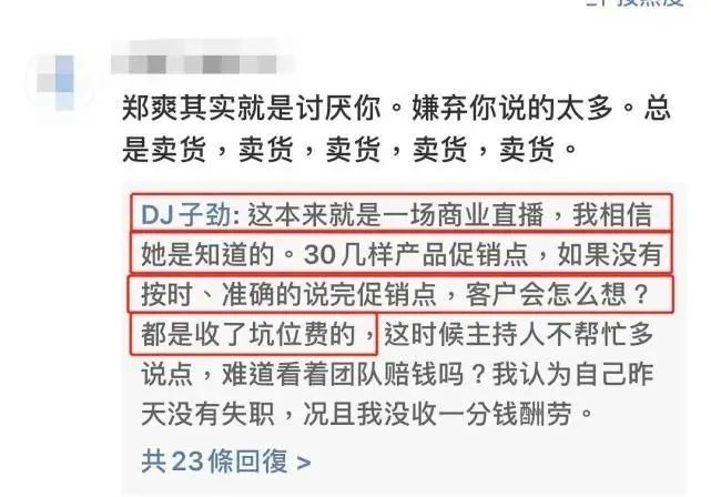 参与直播的男主持人@DJ子劲 之后对此进行了回应,表示郑爽本人清楚,这是一次商业直播,因为她是收了商家坑位费的,有30多个促销点,应该准时、准确地说完每一件商品,否则很可能违约导致郑爽赔钱。