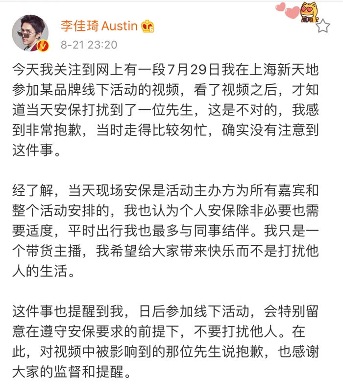 8月21日深夜,李佳琦就此事在个人微博上道歉。他表示看了视频之后,才知道当天安保打扰到了一位先生,这是不对的,感到非常抱歉,当时走得比较匆忙,确实没有注意到这件事。他接着表示,日后参加线下活动,会特别留意在遵守安保要求的前提下,不要打扰他人。