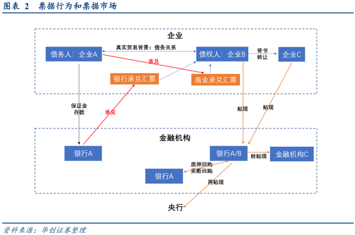 (1)出票和承兑环节通俗地讲即为票据的“一级市场”,其后在企业间的流转通过“背书转让”完成,均应基于“真实贸易”背景。出票和承兑是“绑定”的环节,《票据法》规定“出票人签发汇票后,即承担保证该汇票承兑和付款的责任”,票据的产生需要基于“真实贸易”背景,商业汇票交付到收款人手中后,持有票据的企业可以通过背书转让的方式将票据转让给其他企业,但同样要求有“真实贸易”背景。