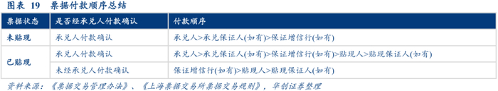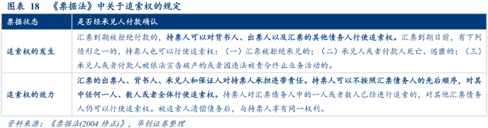 识别标准化票据的信用主体,需要了解票据的偿付链条。如上文所述,承兑人是票据的直接偿付主体,当承兑人拒绝付款时,票据权利人可发起追索;根据《票据法》对于追索权的规定,持票人票据“背书链”上的主体均可以发起追索,且可以不分先后顺序;所以,与债券的单一偿付主体不同,票据有多个具有付款义务的责任主体。