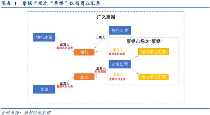 通常所称票据市场的“票据”是狭义票据,特指商业汇票,即出票人为企业和其他组织的汇票,与银行汇票、银行本票、支票等广义票据无关。