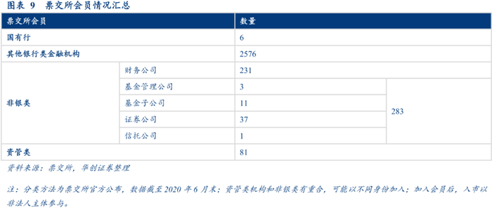 截至2020年6月末,票交所会员中已经包含商业银行、非银类和资管类等会员主体;其中,非银类除财务公司之外,证券公司、信托公司等;部分头部公募基金管理公司已经取得会员资格;非银机构还以资管名义参与成为票交所会员。值得注意的是,成为会员并未意味着可以参与交易,当前实际参与的主体主要是商业银和财务公司,有部分券商资管和自营也参与交易。
