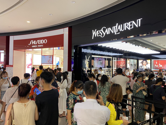 澎湃新闻在海南三亚海棠湾的三亚国际免税城看到,上午10时30分左右,该免税城的两栋楼内已经人头攒动。在B区的钟表/珠宝/精品区,一些热门品牌如蒂芙尼(Tiffany)、宝格丽(Bvlgari)、普拉达(Prada)等已经开始排队;而在属于国际精品/美容及个人护理的A区,则已经人声鼎沸。