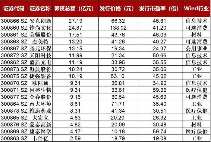 增量部分,发行规模较大的新股表现更加占优,享受一定的龙头溢价,并且市场更青睐于具有壁垒的科创与新兴产业股票,对半导体、计算机的追捧程度较高。这从创业板新股询价后的估值可见一斑:首批上市的18家公司中,天阳科技(银行IT领先企业)、安克创新(全球消费电子知名品牌商)的首发估值为50.66倍、46.81倍,公司处于新经济产业并且具备一定的竞争优势,而卡倍亿(专业汽车线缆生厂商)、大宏立(破碎筛分设备领先制造商)估值为19.08倍、26.32倍,市场给予传统行业的估值并不高。预期新股上市后表现将进一步分化。