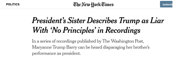 《纽约时报》:特朗普姐姐在录音中将特朗普描述为“没有原则”的骗子