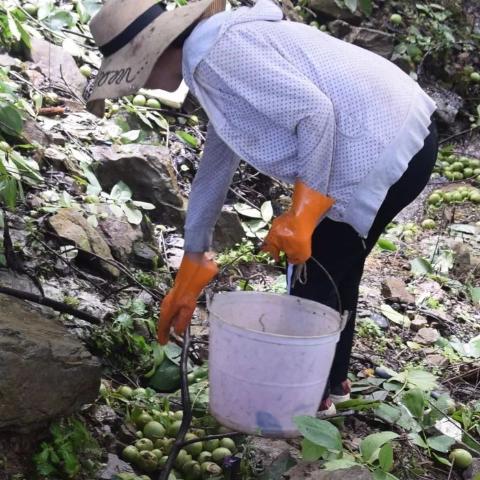 山路崎岖陡峭,果农摘一次果都要爬40多分钟。天刚刚亮,他们就得开始背起背篓拿着竹竿上山采摘核桃,上树下树人均一天采摘才百来斤,十分艰辛不易。