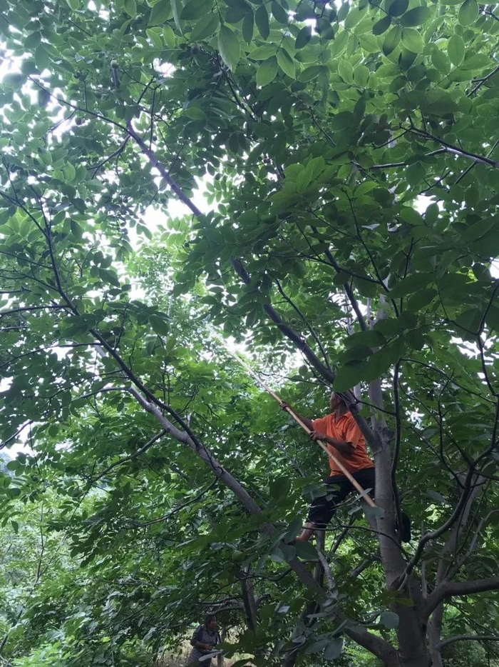 想要在老核桃树上采摘一颗核桃绝非易事,一般的老树高达10米以上,采摘每一颗都需要人工爬上树,用竹竿使劲敲打才能采摘下来。