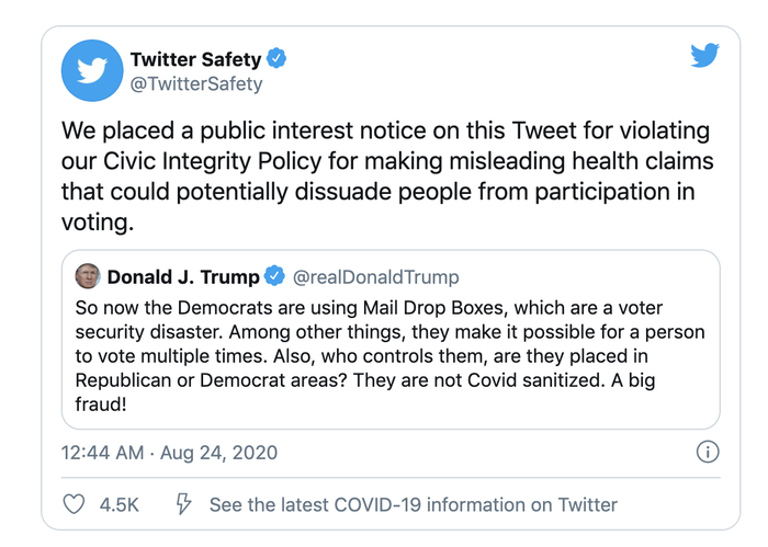 8月23日,推特(Twitter)在美国总统唐纳德·特朗普的一条批评民主党为投票者推广投递箱的推文旁备注了免责声明,称该推文违反了公司“公民和选举诚信”规则。