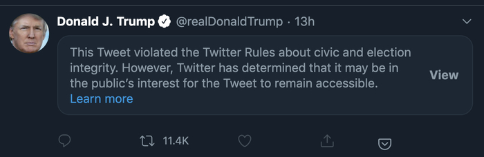 推特在这条推文上附上了一条公共利益声明,称该推文违反了公司公民和选举诚信规则,在公共卫生问题上对民众进行误导,并且可能潜在阻止人们参与投票选举。