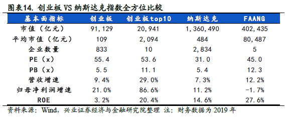 1)从规模上看,创业板和创业板Top10市值规模分别为9.1万亿和2.1万亿,纳斯达克和FAANG规模分别为136万亿和40.2万亿。