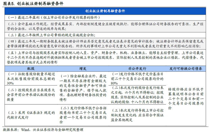 再融资提速,简化流程,小额快速通道提高审核效率。创业板注册制首次明确了上市公司各证券品种的再融资基本发行条件,并加强了对财务会计报告的披露要求,推动提高上市公司质量。同时优化注册程序。一是严格审核时限。要求交易所应当自受理注册申请文件之日起两个月内形成审核意见,中国证监会收到交易所审核意见后十五个工作日内做出注册或不予注册的决定。二是建立小额快速发行的审核注册简易程序。对于上市公司依照年度股东大会授权提出的,向特定对象发行融资总额不超过人民币3亿元且不超过公司最近一年末净资产20%的股票发行申请,使用简易程序。交易所应在两个工作日受理,三个工作日完成审核,中国证监会三个工作日完成注册。