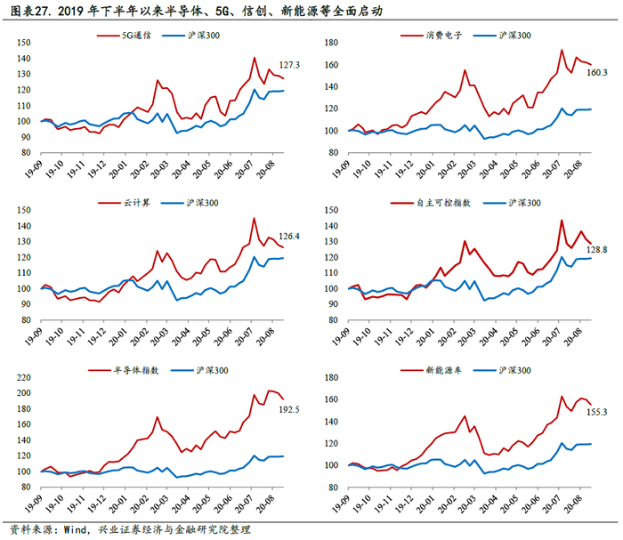 3)趋势三:新一轮科技创新周期,大创新企业受益。中国正处在新一轮科技创新周期,经济动能转换、国家对资本市场前所未有的重视,19年以来半导体、5G、信创、新能源等科技领域全面上行。改革之中,大创新企业长期受益。