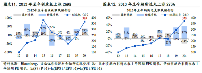2013年至今,创业板与纳斯达克指数回报分别为269%、275%,而创业板波动较高(43% VS 14%)。拆分估值和盈利对涨幅贡献,创业板盈利贡献优于纳斯达克,但近年来受到商誉减值扰动。综合比较,创业板是“信息+医药”的牛市,纳斯达克是“信息+消费”的牛市。