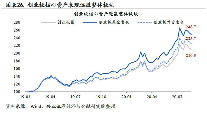 2)趋势二:市场加速分化,核心资产受益。注册制和退市制度构筑资本市场“活水”,市场分化趋势加速:创业板内前10%的公司占据超40%的成交额;低价股、小盘股、低热度股的占比大幅提升至20%附近;为基金重仓(148.7%)和外资重仓(125.7%)的核心资产大幅跑赢创业板指(110.5%)。