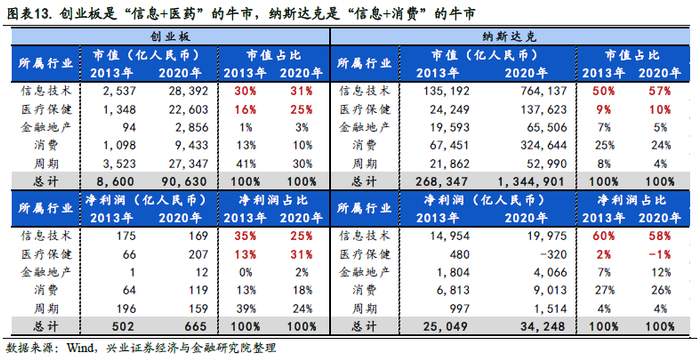 创业板和纳斯达克最大差异体现在行业结构变化上,创业板是“信息+医药”的牛市,纳斯达克是“信息+消费”的牛市。创业板信息技术的市值占比保持在30%左右,医疗保健的市值占比从16%增至25%、净利占比从13%增至31%。纳斯达克信息技术的市值占比从50%增至57%,消费的市值占比和净利占比维持在25%附近。过去8年,创业板中医药生物板块大幅扩张,信息技术板块稳步扩张;纳斯达克指数则围绕着FAANG的科技软硬件和电商零售快速发展。