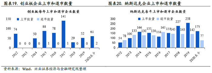 过去A股退市制度在实践中,落实案例较少,作为对比,纳斯达克市场2012年至今几乎每年都有超过100家公司退市,资本市场形成“活水”。当资本市场不能很好地实现自身清理和循环,可能会造成资本要素的浪费。