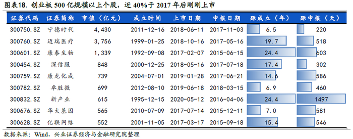 因为漫长的上市审核流程和较为严格的上市条件,目前创业板500亿规模以上个股,近40%(9家/24家)于2017年后刚刚上市。产业中的核心资产登陆资本市场时间大大拖后,近年来二级市场投资者才能够配置这些优质资产。