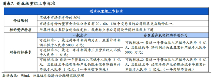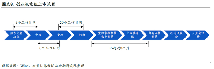 创业板重组放松。2019年10月,创业板重组松绑,且允许符合国家战略的高新技术产业和战略性新兴产业相关资产在创业板重组上市。此次注册制改革,创业板重组上市同步推行注册制,一是明确重组标的,需为高新技术、战略新兴产业,其他资产不得在创业板重组上市。二是规范审核程序,规定重组审核机构初审后,提交创业板上市委员会审议。三是严格审核时限,对于重组上市的回复问询不超过3个月。允许高新技术产业和战略性新兴产业相关资产在创业板重组上市,有利于提升创业板公司质量,助力新兴产业的发展壮大。
