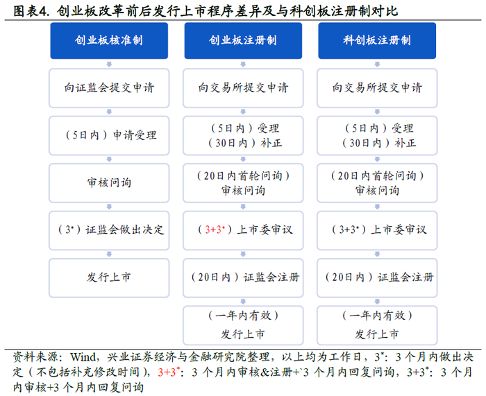2)再融资、重组放开:再融资简化流程,小额快速通道提高审核效率;重组上市松绑,明确重组标的、规范审核流程、严格审核时限。
