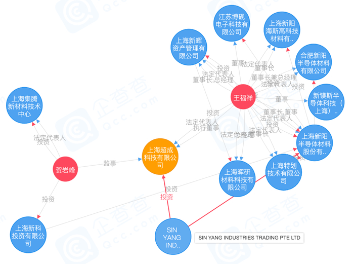 企查查信息显示,超成科技成立于2020年4月16日,由SIN YANG INDUSTRIES & TRADING PTE LTD(新加坡新阳) 100%控股,法定代表人为上海新阳实控人王福祥,该控股公司同时也为上市公司上海新阳控股股东,持股比例为19.16%。