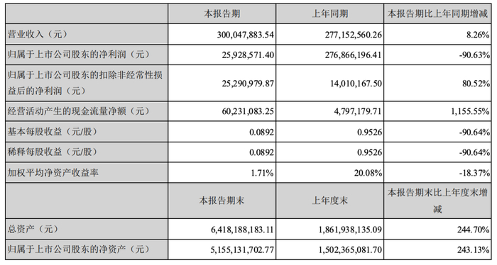 2020年上半年,上海新阳实现营业收入3.00亿元,同比增长8.26%;归属净利润为2592.86万元,同比下降90.63%;扣非净利润2529.10万元,同比增长80.52%。