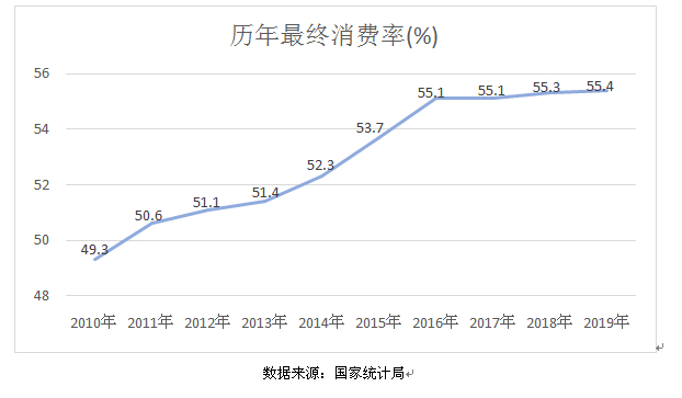 相较大多数国家和地区而言,中国经济具有实现“内循环”的基础,但单纯“内循环”不是我们追求的目标。我们追求的是在“内循环”为主的基础上实现“内外双循环”。中国经济“内循环”的有利条件在于拥有足够规模的国内市场和全球最完整的工业体系。尽管在2008年之前我国经济的外贸依存度很高,经过过去十年的调整,国内最终消费在GDP中的占比已逐年上升(见下图)。