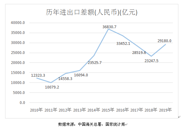另外,从外贸平衡度来看,自2015年起,我国的净出口额也是逐年下降(见下图)的,2019年稍有回升。