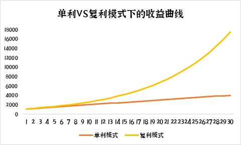 与之相对地,是“单利”,即不管我们投资多少期、每期产生多少收益,参与下一期的投资中都只有我们一开始的本金。