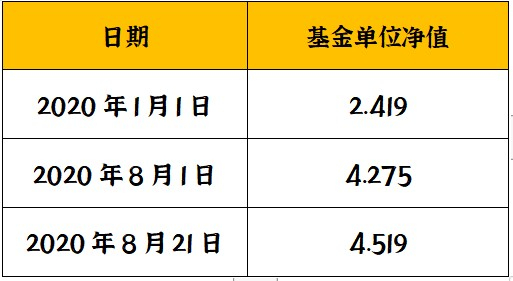 假如基民小广在2020年1月1日下午3点前买入基金1000元,一直持有至8月21日,那么小广的基金账户总金额为:1000/2.419*4.519=1868.13元。