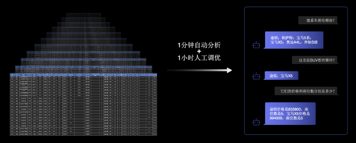 吴甜表示,1分钟自动分析后,产出的问答机器人已经可以准确回答大部分基于表格的事实型问题;再进行1小时左右的人工调优后,问答机器人达到的水平,相当于以往通过至少2周人工整理FAQ建设的问答系统的水平。