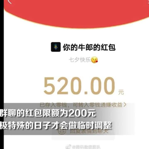 8月25日,微信官方微博宣布,七夕节 00:00-23:59,微信普通红包的单个金额上限,由 200 元上调到 520 元。