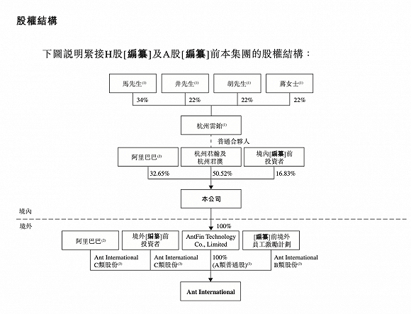 招股书称,按照《香港上市规则》的定义,马云、井贤栋、胡晓云、蒋芳、杭州云铂、杭州君瀚、杭州君澳及阿里巴巴均可视作蚂蚁金服控股股东。然而,根据相关中国法律法规,仅杭州君瀚及杭州君澳,而非阿里巴巴可被视作蚂蚁集团控股股东。